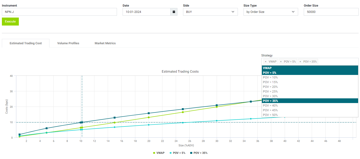 In the example below, the user has elected to analyse an order to BUY 50,000 NPN.J. They can also select a given % of ADV. The Expected Cost Impact model is then executed, and displays the results based on three default strategies (many more strategies are available as you can see in the drop down):