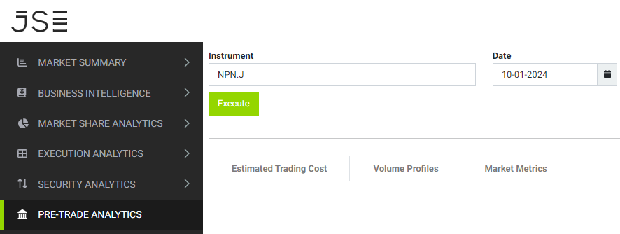 The JSE Trade Explorer presents the results as the Expected Price Impact in bps (y axis) for a given %ADV (x axis). The dotted ‘cross-hairs’ show that an order for 50,000 shares of NPN.J is approximately 10.2% of ADV and the expected cost of trading at 35% of volume (dark blue line) is around 9.8bps. Meanwhile the expected cost of trading at 5% of volume (light blue line) is around 5bps, while a VWAP strategy (green line) is a little higher. By hovering over the graph with the mouse, the user can see the expected cost for any point on the curves.